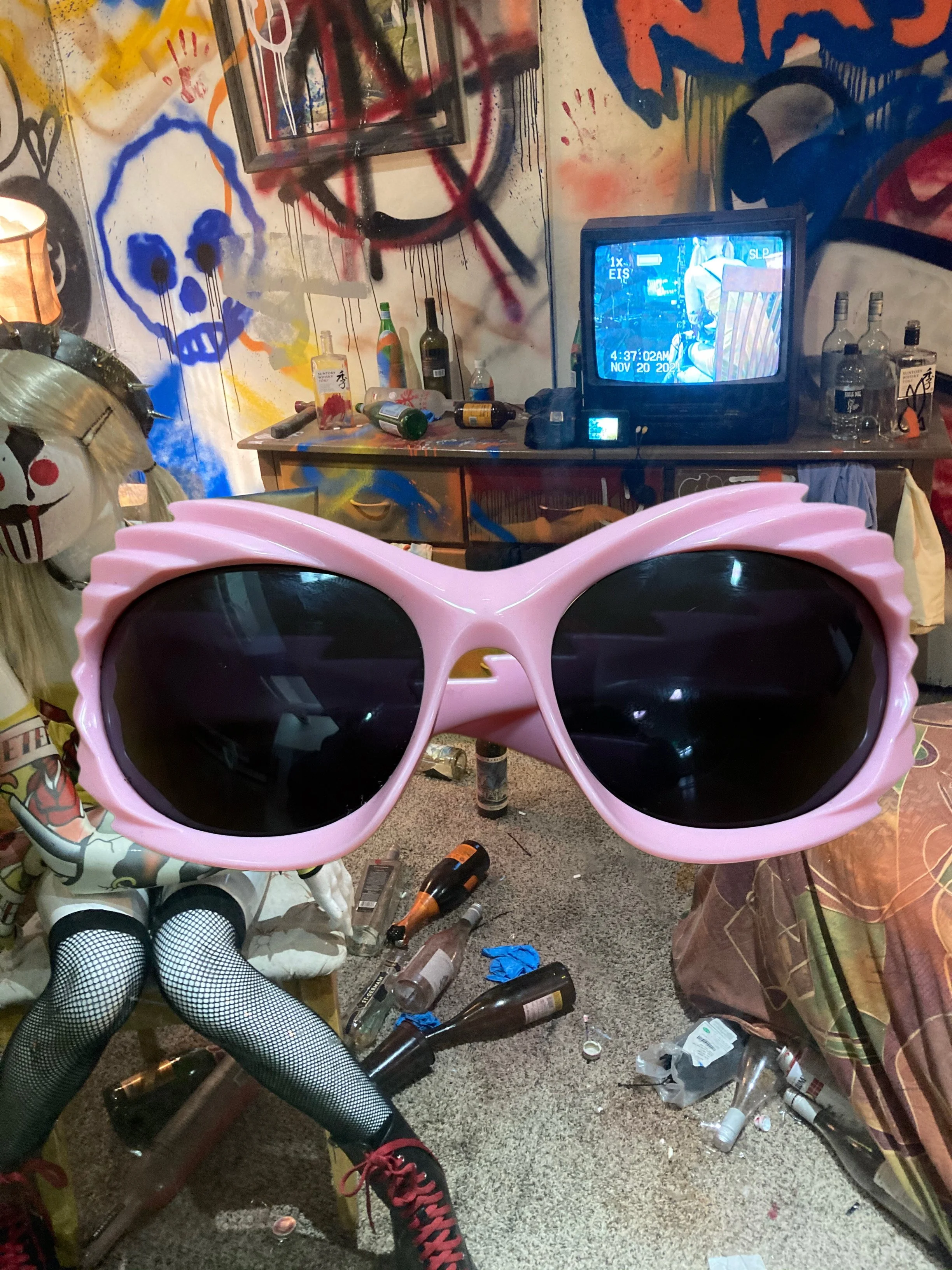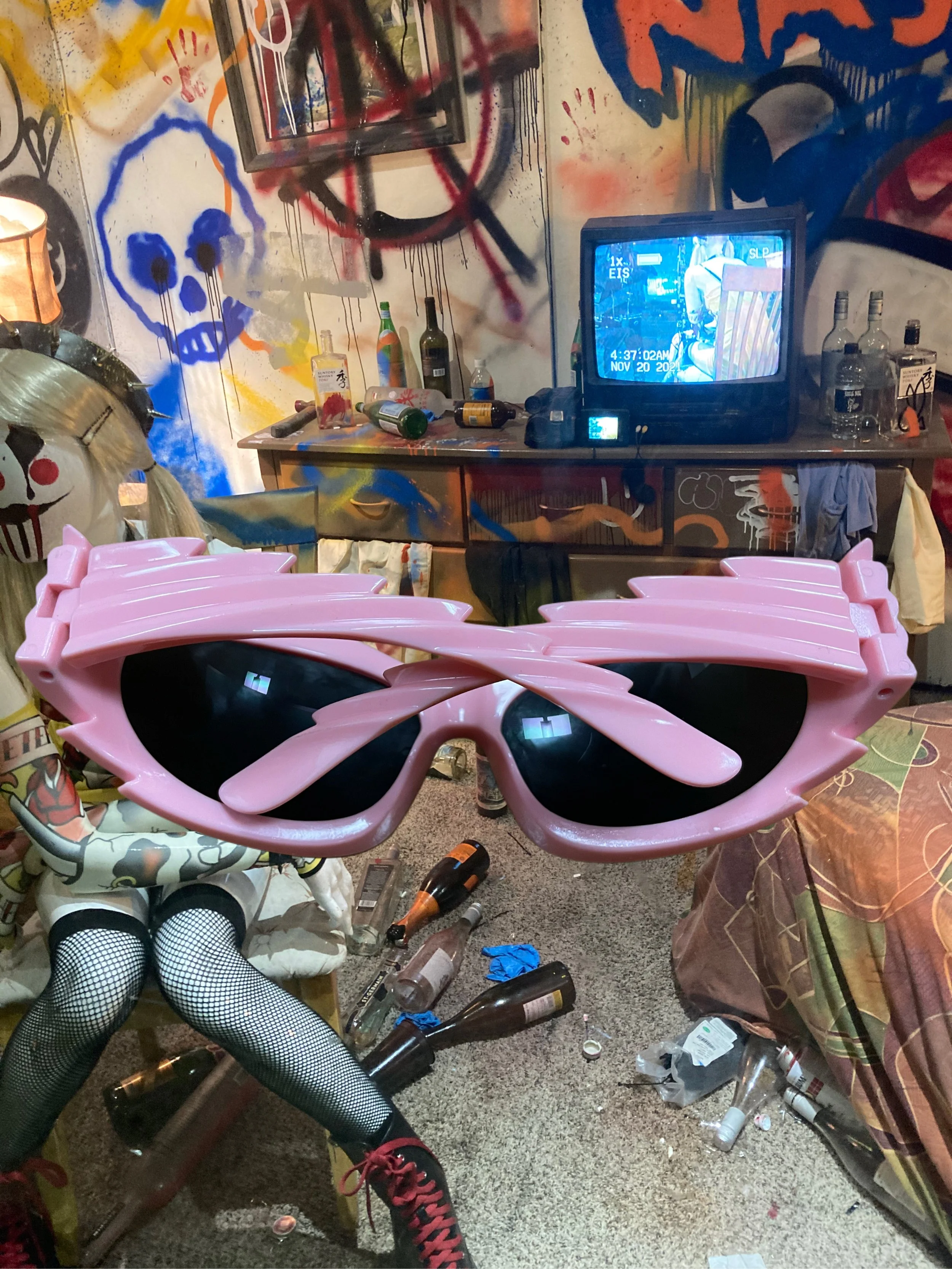 Large pink sunglasses with black lenses in the foreground, cluttered room with graffiti on the walls, a TV showing a security camera feed, bottles, and various objects scattered on surface and floor.