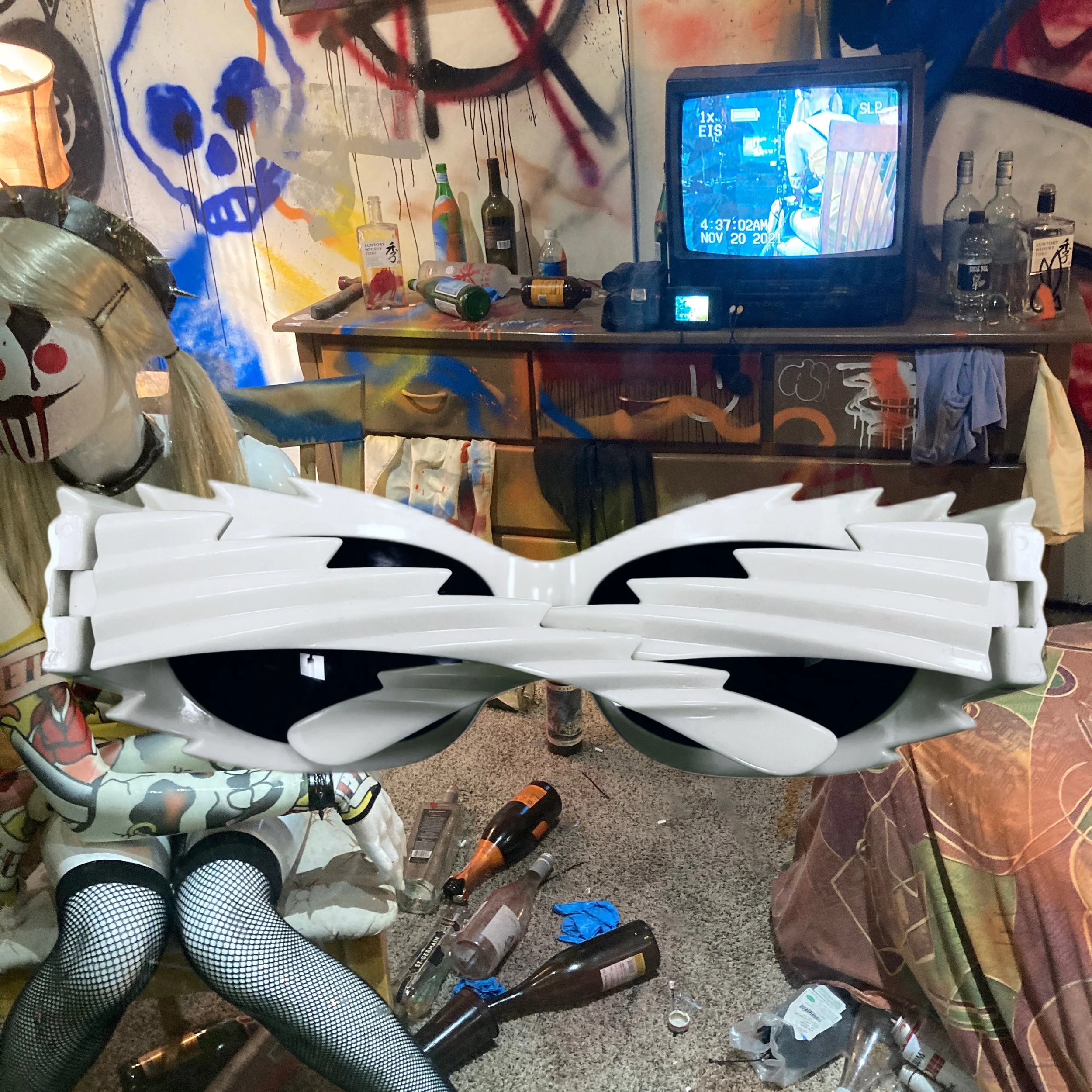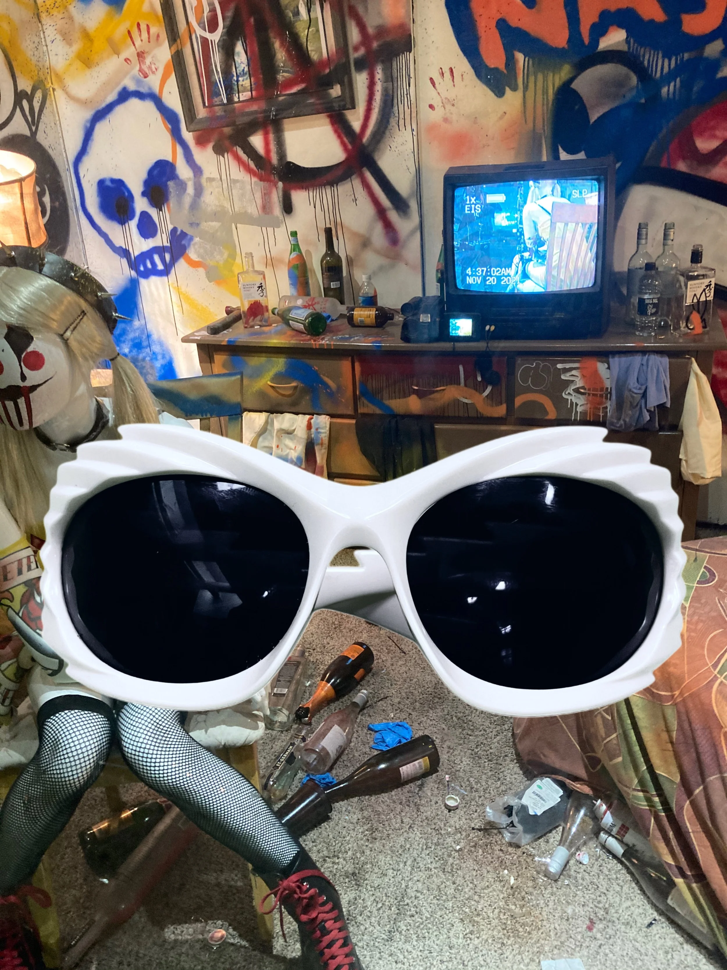 A cluttered room with graffiti-covered walls, a TV showing a person sitting in a chair, a table with empty bottles and cans, and a large pair of white sunglasses with black lenses in the foreground. There is also a mannequin head with a mask, and the
